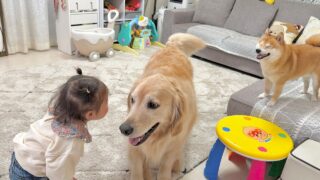 柴犬・豆柴 逃げ回る豆柴を必死に止めようとするゴールデンレトリバーと犬語で抗議する1歳児