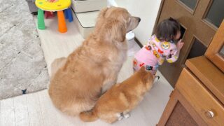 柴犬・豆柴 大切な相棒とお別れしないといけないとわかると絶望的な表情を見せる豆柴とゴールデンレトリバーと1歳児