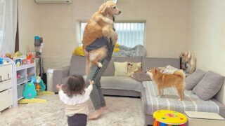 柴犬・豆柴 ゴールデンレトリバーが抱っこされているのを見て嫉妬心をあらわにする豆柴と1歳児