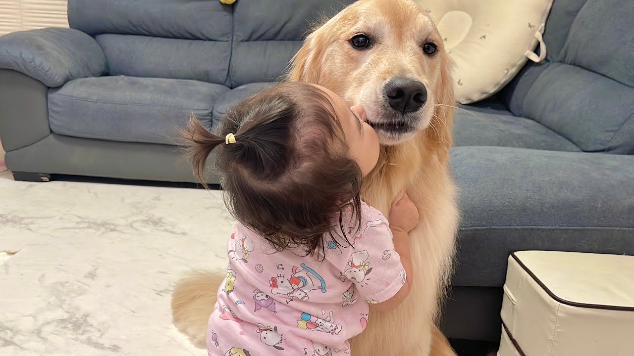 毛がもふもふになって帰ってくると1歳児から熱い抱擁を受ける豆柴とゴールデンレトリバー