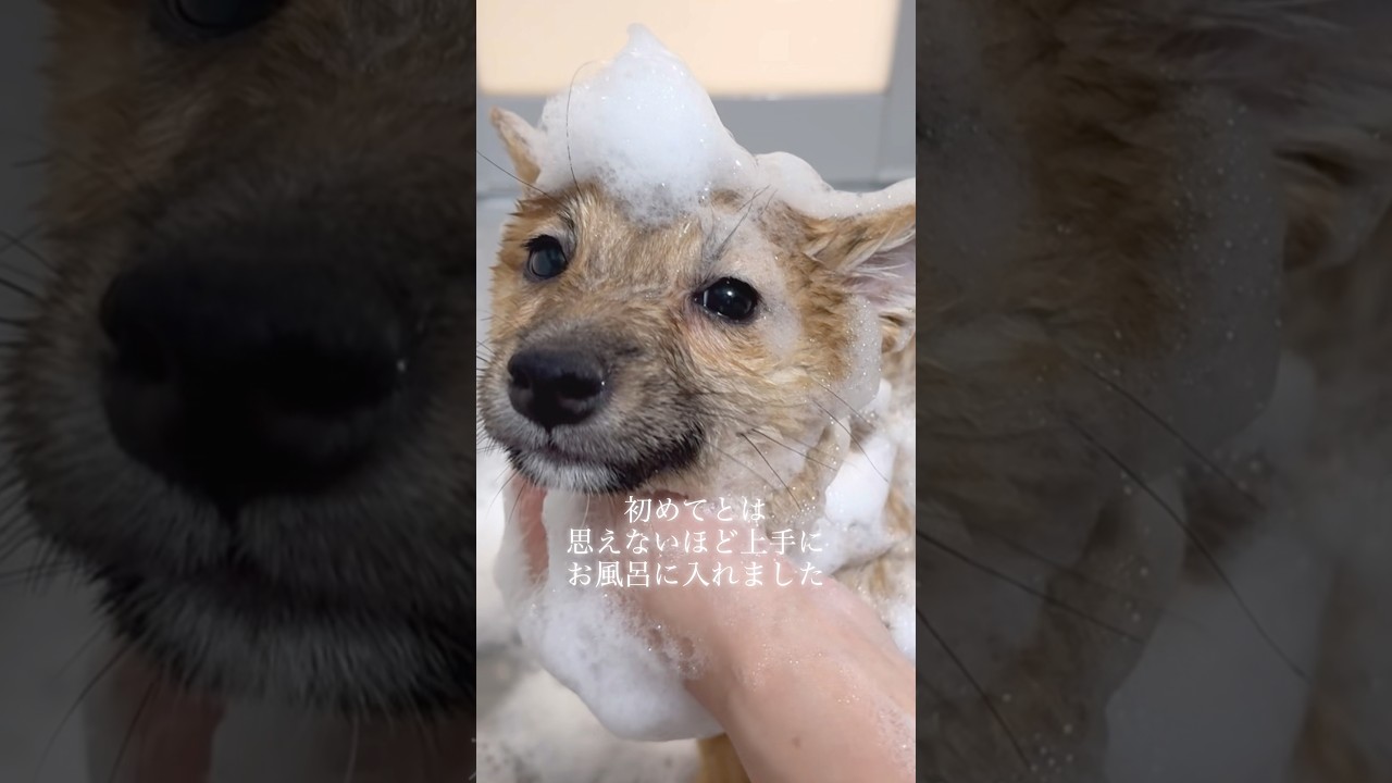 The rescued Mame Shiba puppy’s first bath after recovering from a cold.
