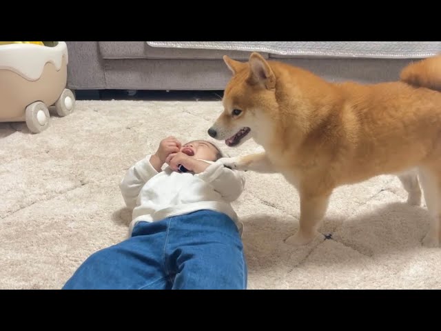 小さい体でも1歳児に負けずしっかり兄の威厳を見せつける豆柴
