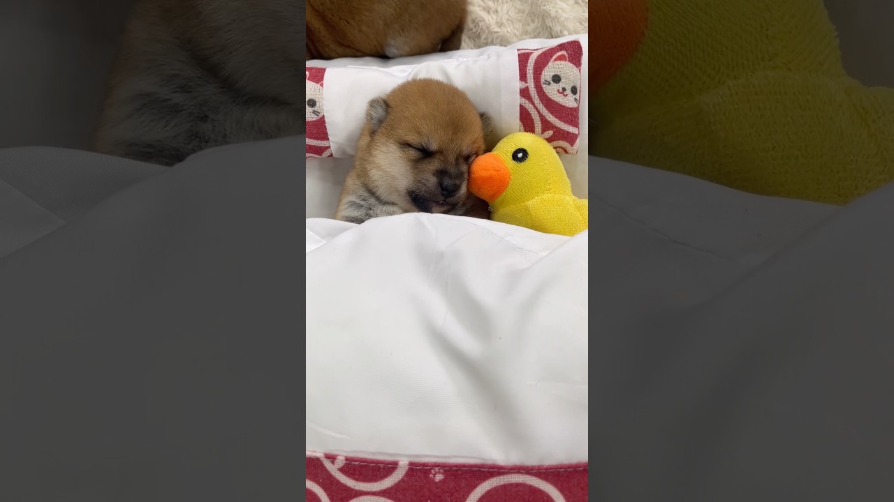 【豆柴犬】アヒルと一緒に寝ててとても可愛い赤ちゃん😘🫶