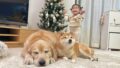 クリスマスツリーを大好きなキラキラにする一歳児とそれを見守る豆柴とゴールデンレトリバー
