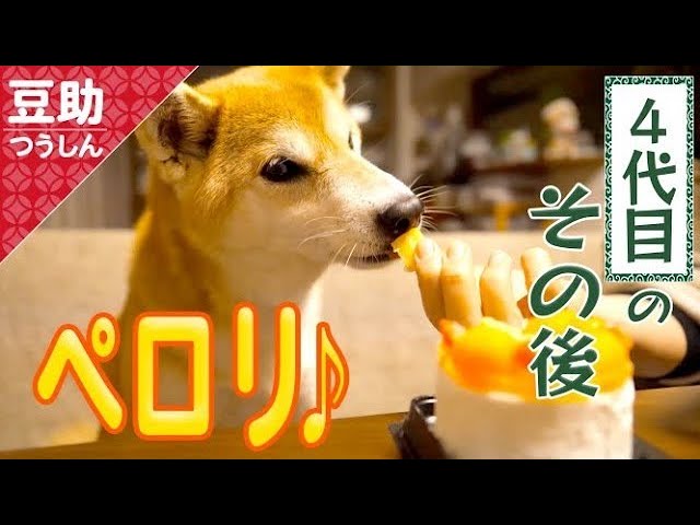 豆助その後シリーズ、「豆助んち」の25代目以外では4代目が最も登場してくれてるね!今回はケーキがとっても気に入ったみたいだね♪最初はむむむ?な感じだったのが、最後はもうないのー?って感じになってるね。また買ってもらえるよ、それまで元気にしててね♡