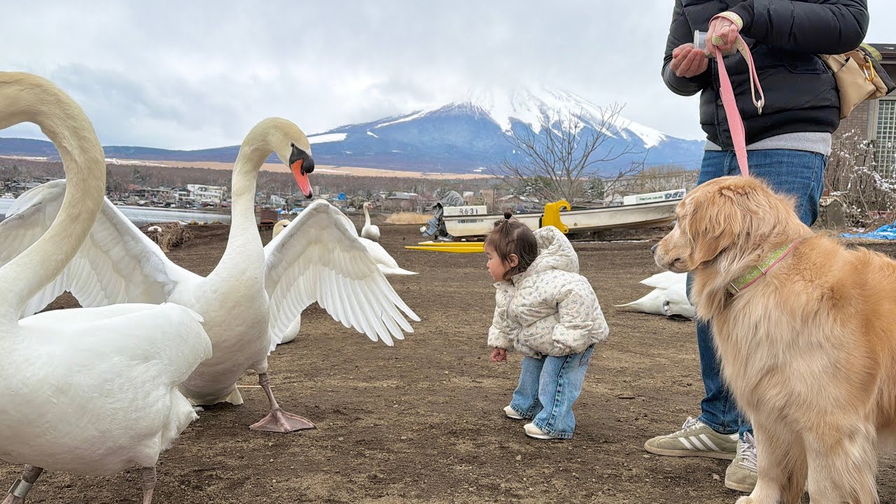 体を大きく見せ威嚇してくる相手に対抗しようとする1歳児とその様子を見守るゴールデンレトリバー
