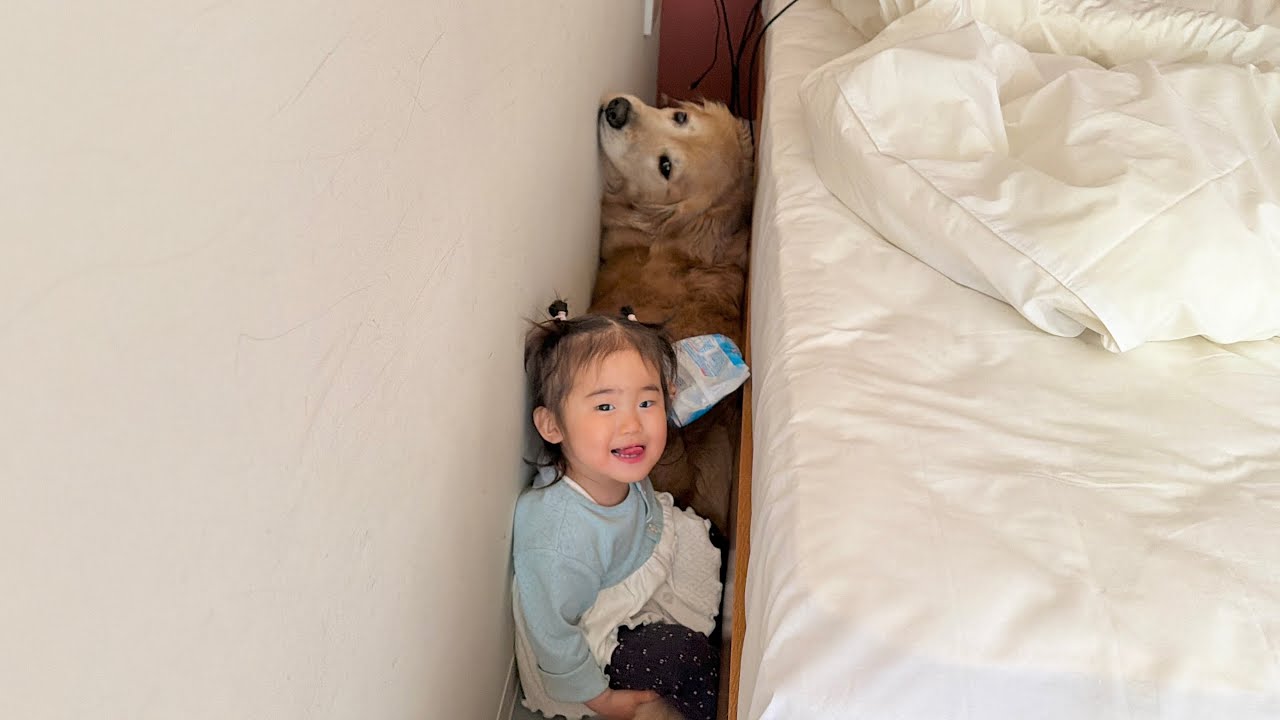ママにいたずらが見つかった1歳児から助けを求めに来られるゴールデンレトリバー