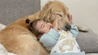 柴犬・豆柴 大好きで堪らないという気持ちを何度も1歳児から伝えられるゴールデンレトリバー